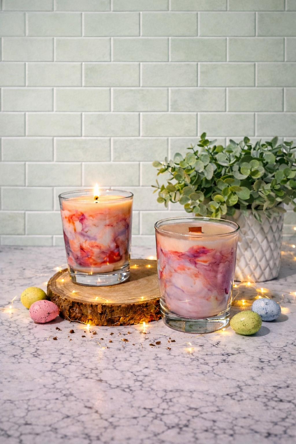 Beautiful hand-poured soy wax candle. Choose your own scent. Choose whether to have it plain, coloured or marbled. Comes packaged in a gorgeous glass that can be re-used when empty. This candle burns for around 42-44 hours. Candle shown is wood wick with orange marble.